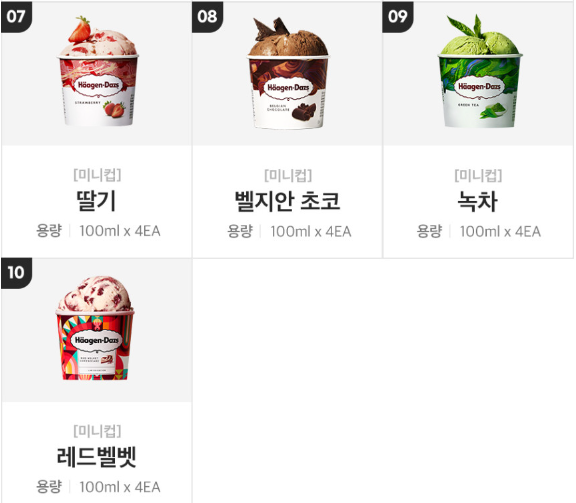 파인트뿐 아니라 싱글바와 미니컵도 있는데요. 싱글바는 6개에 35400원 미니컵은 6개+6개에 35400원으로 신제품 제외한 기존 메뉴에서 3가지 맛 선택이 가능하다고 합니다. 미니컵이라면 한 가지 맛에 4개씩 받게 되는 셈이겠네요.