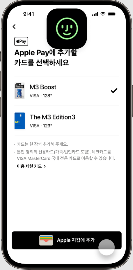 애플페이(Apple Pay)의 설정은 정말 간단하기 때문에 너무 큰 걱정은 안 하셔도 됩니다. iPhone의 '지갑' 앱에 추가만 하면 되기 때문이죠. 등록만 제대로 한다면 포인트 적립이나 카드사에서 별도로 제공해 주는 혜택 또한 누릴 수 있게 됩니다. 현대카드 앱에서 추가하는 방법은 아래에 있습니다.
