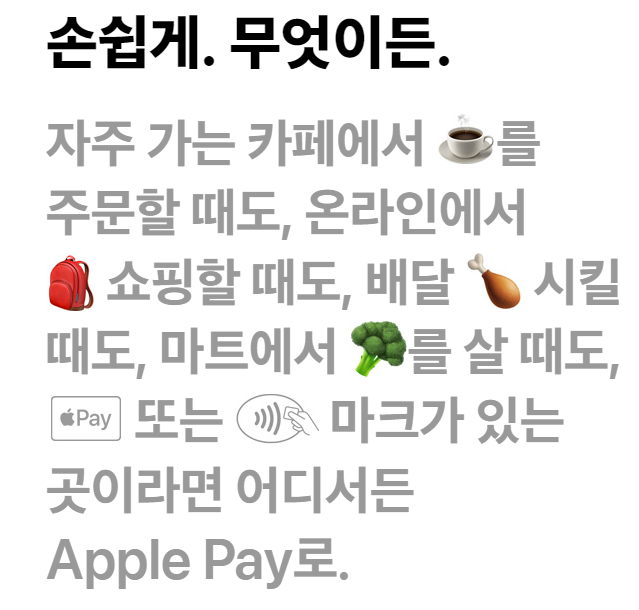 우리에겐 가장 흔한 삼성페이가 있습니다. 이제는 애플페이도 대한민국에서 사용할 수 있게 되었는데요. 애플페이는 이제는 완벽한 스마트 생활을 하는 현대 사회를 위한 결제 방식입니다. 카드나 현금을 실물로 들고 다니지 않고 매장이나 웹사이트뿐 아니라 앱에서 또한 쉽고 안전하게 결제할 수 있는 결제 방식이죠.