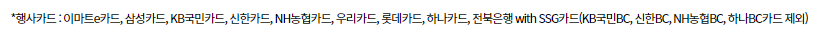 └ 관련 상품 5천 원 이상 제휴카드(BC/현대카드)로 결제 시, 모바일 앱 통합 바코드 스캔 시 5천 원 금액권 제공