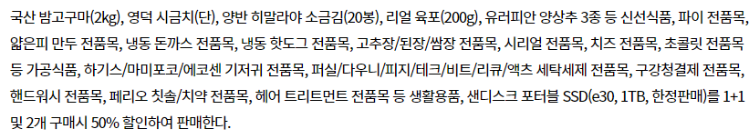상품 한 개 구매 시 한 개 더 주는 1+1 행사와, 모든 품목 50% 할인과 같이 반값 조차 되지 않는 상품과 신선상품과 가공식품, 가전제품까지 총 100여 가지의 상품을 할인 행사에 참여시켰습니다.